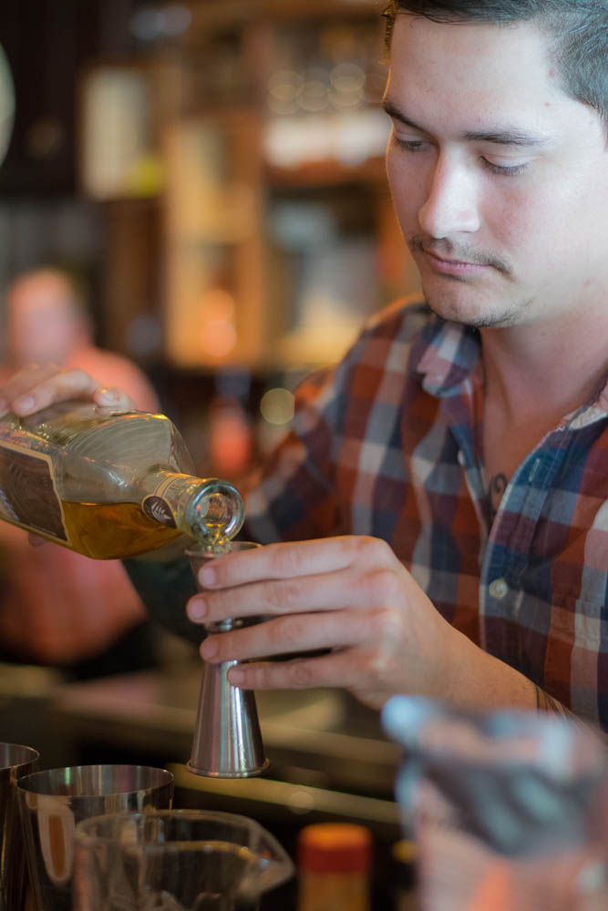 Following the Gallant Sir, we tried Jason’s Onrush. The flavors in Jason’s cocktails match his personality: deliberate, upfront and created with obvious experience. Using tequila, Genepy des Alpes, St. George Green Chile Vodka, poblano syrup, pineapple syrup, and lime. The poblano syrup in this cocktail combined with the green chile vodka create a spicy cocktail that isn’t masked entirely by fruit. In fact, the pineapple enhanced the spicy flavors. Rest assured, it was garnished with Jason’s trademark mint top garnish.