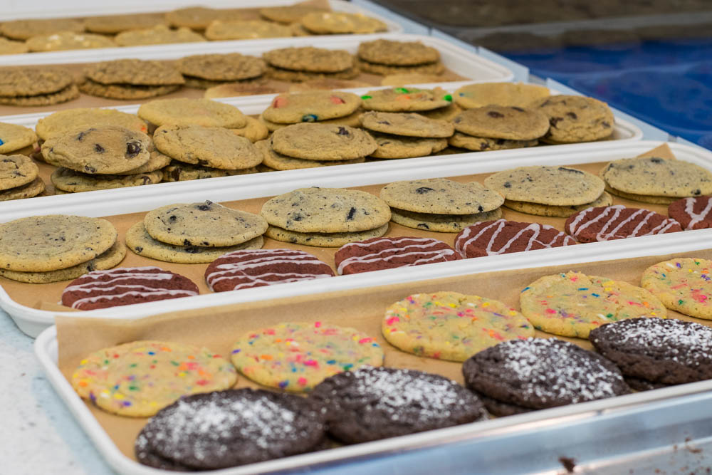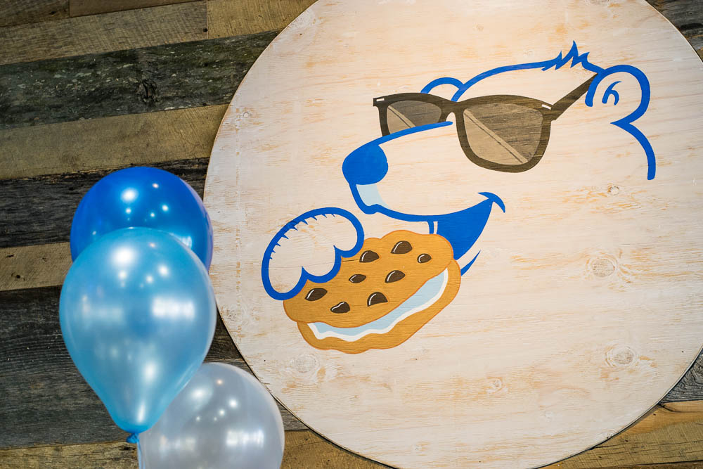 The build-your-own ice cream sandwich shop boasts 12 different ice creams, 12 different types of cookies, brownies (Ghirardelli Triple Chocolate, to be exact), and donuts. Customers have the option to create ice cream sandwich with any variation of tops and bottoms, as well as choose their ice cream flavors. All cookies are baked from scratch on site daily, in order to have the proper texture and shape the dough is set in balls and held in the freezer for 24 hours. Additionally, the ice cream freezers hold 120 tubs of ice cream which is refilled 2-3 times a week. The most flavor is chocolate chip cookies for both top and bottom with vanilla ice cream in the middle. Customers who have dairy and/or gluten concerns have the option of soy ice cream and gluten free chocolate chip cookies.