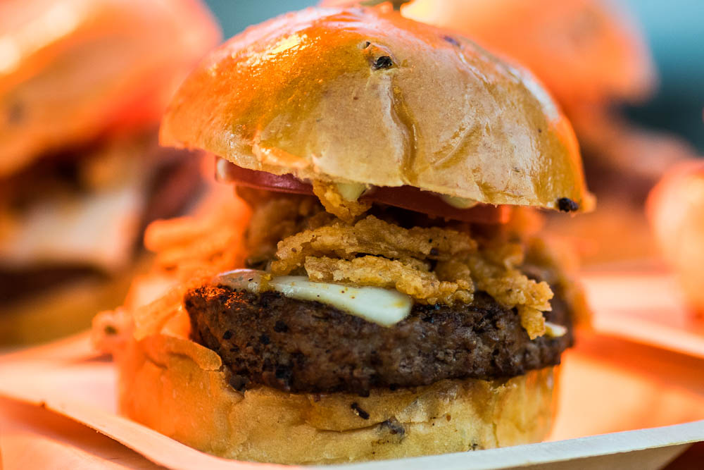 Jennie-O: The Renaissance Turkey Burger, made with freshly ground hand formed turkey slider, seared in avocado oil with bacon compote, baby arugula and creamy brie cheese on a brioche bun topped with crispy fried shallots.