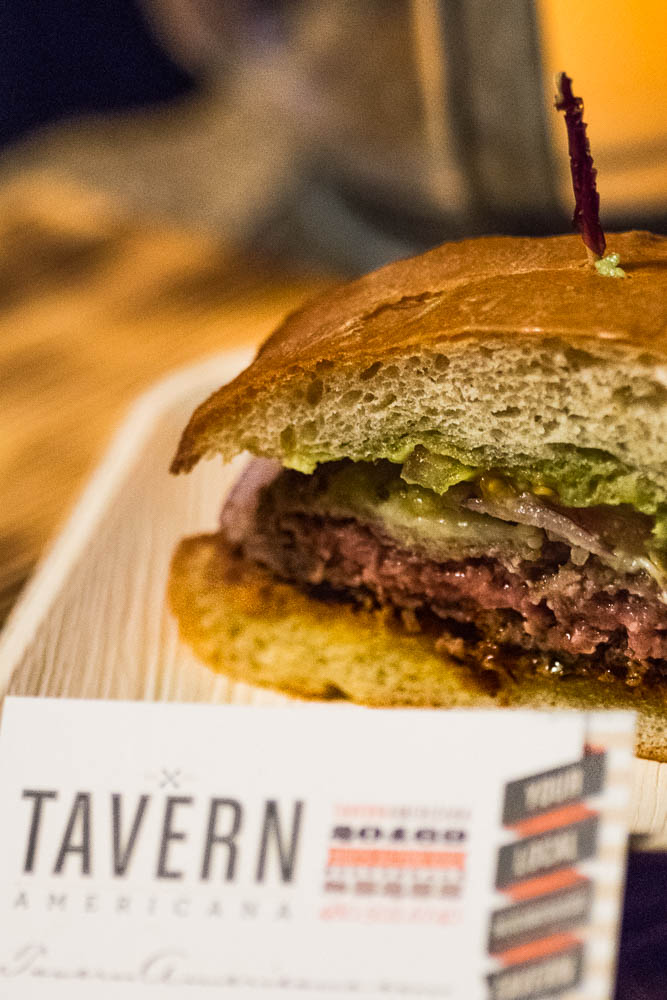 Tavern Americana: Hamburguesas de torta, breaded niman ranch chuck burger topped with pepper jack cheese, pickled jalapenos, avocado, tomato, red onion, chipotle sauce and served on a fresh Local La Sonorenese telera bread.