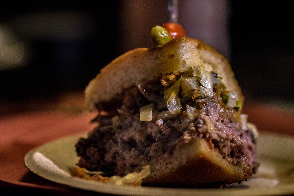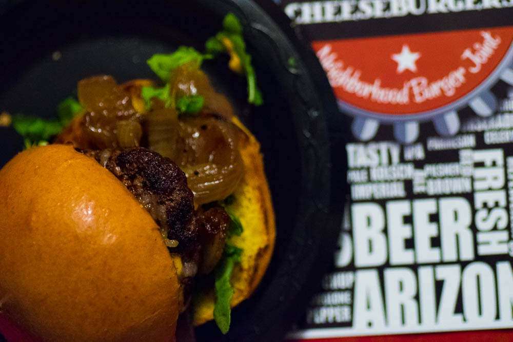 Hilton Scottsdale Resort and Villas: Guajillo Seared Beef Angus Slider, made with avocado lime aioli, roma tomato fried jalapenos, onion strings, habanero and Monterrey jack cheese on a green chili brioche bun.