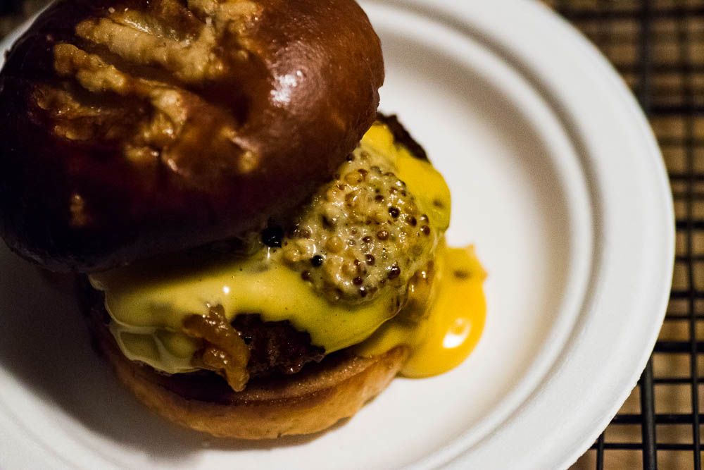 Hopdoddy: Death by Bacon, Hopdoddy’s own bacon beef patty topped with beer braised onions, pork belly and their own beer cheese all on top of a homemade soft pretzel bun.