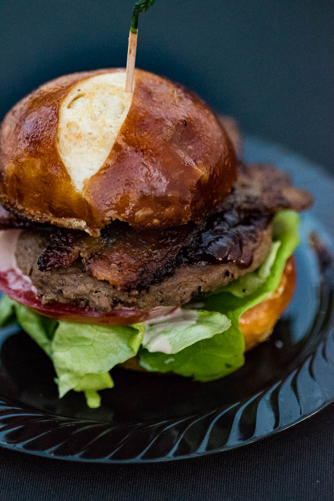 Casino Arizona: Casino Pepper Bacon Burger, made with braised beef short rib with freshly ground prime sirloin on a pretzel slider, garnished with black pepper cured bacon, caramelized onion jam, sliced roma tomatoes and butter lettuce.