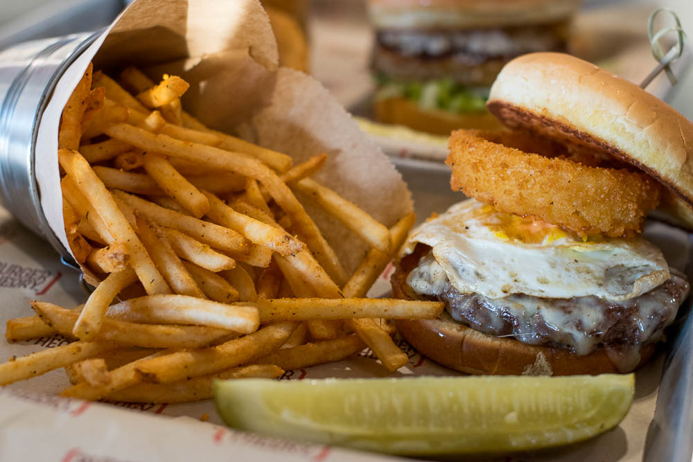 We tried our hand at creating our own burgers (and were fairly successful we think) and created 2 very different burgers. The first burger we created was a turkey burger. The turkey burger’s toppings included: lettuce, goat cheese, grilled onions and mayo. Hands down the turkey burger was the star of the evening. Packed full of flavor and deliciously moist, it was fantastic. Another positive note about our turkey burger was the amount of goat cheese loaded onto this burger, there was no shortage of cheese which makes for a super tasty burger! Our other burger was a beef burger (a blend of Angus chuck, brisket and short rib). We topped it with an onion ring, fried egg, jack cheese, and KGB sauce (similar to a thousand island dressing). This was a beast of a burger! The onion ring was super crispy and delicious!