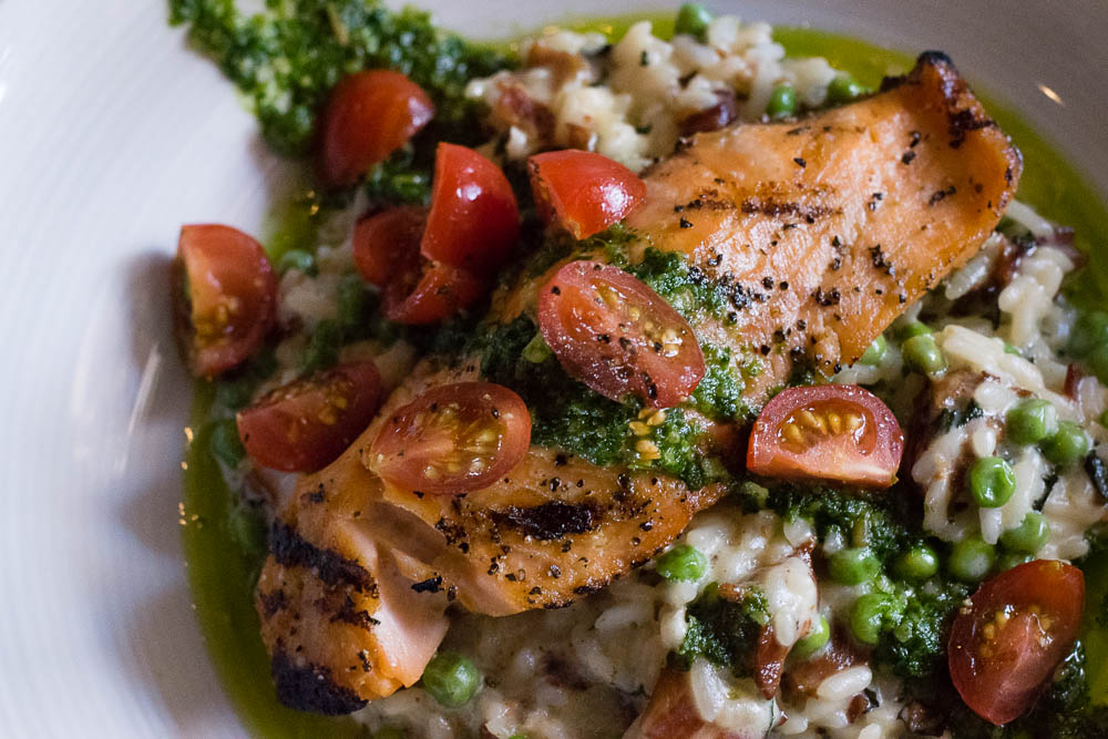 - Salmon (grilled served over sweet pea risotto with mint and bacon, topped with arugula pesto and cherry tomatoes)– By the time we got to entrees we were so stuffed that we thought we couldn’t eat another bite. This salmon however, changed that. Grilled to a perfect medium rare, it was delightful on its own. The sweet pea risotto just added an additional level of deliciousness.