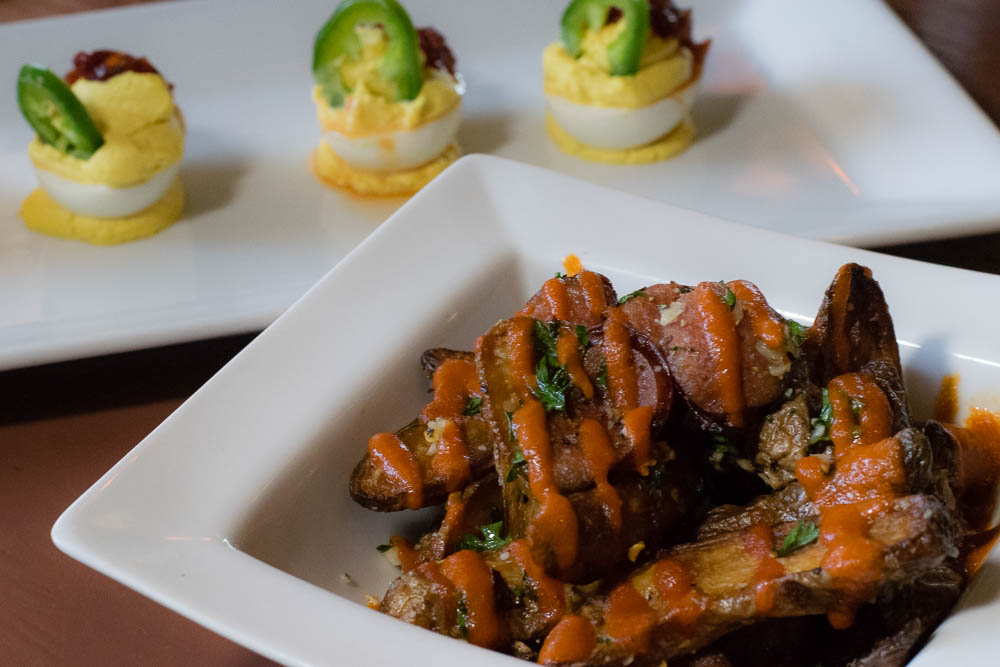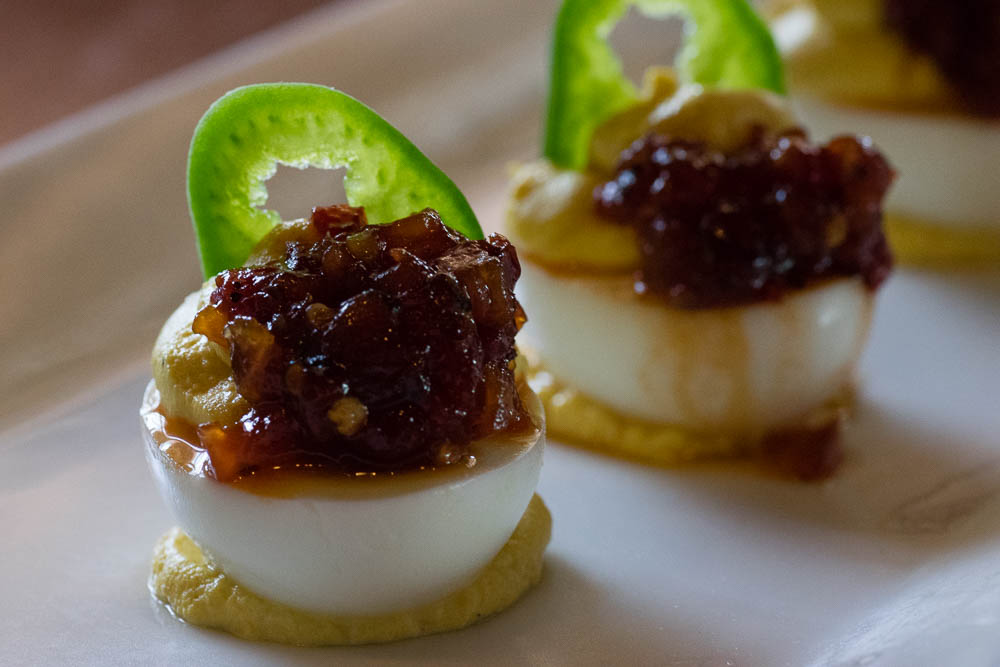 - Deviled Eggs (house made deviled eggs with red chile jam and fresh jalapenos)– We love deviled eggs! Seriously, even after making 5 dozen we aren’t sick of them! The deviled eggs at D’Vine are only on the Happy Hour menu, so get them while you can! They are just how we like them, with the mustard more prominent.