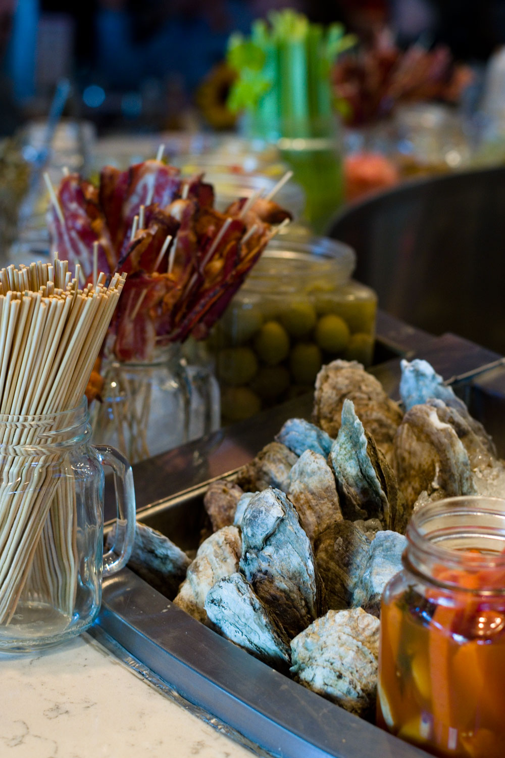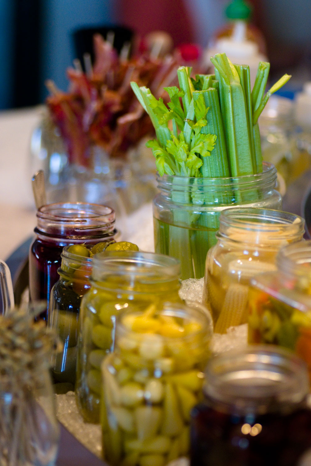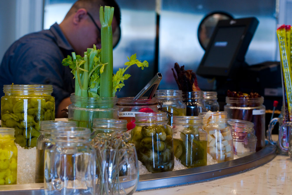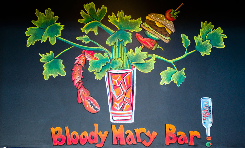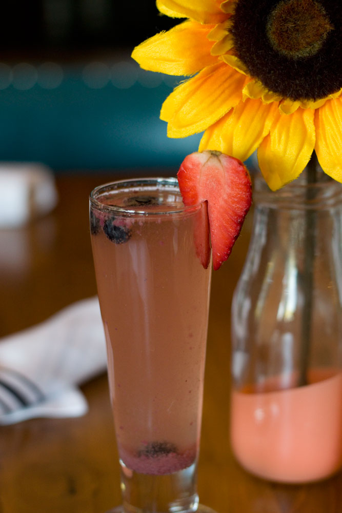 The first thing you see when you walk in is the Build Your Own Bloody Mary Bar. We spoke with Adrian, one of The Hash Kitchen’s Bloody Mary Stylists, he told us about how much work goes to preparing all of the components in the BYOBMB. The BYOBMB boasts 40 different toppings, home made salts (celery and bacon), and vodka infused in house (jalapeno, bacon, cucumber, cilantro lime and smoked salmon). The Bloody Mary mix comes in three levels of spiciness: mild (standard seasoning), medium (chile pepper), and hot (habanero). Among the toppings are: bacon, beef jerky, salami, pickled vegetables (the brussels sprouts were incredible!), olives, traditional vegetables (celery, carrots, olives) and even fresh blue point oysters! We always thought we didn’t like bloody marys but it turns out we just don’t like bad bloody marys. Hash Kitchen has some of the best in the valley! We also tried one of their seasonal fruit mimosas and par for the course thus far, it was great! It wasn’t all fruit juice with a splash of bubbles but rather the opposite.