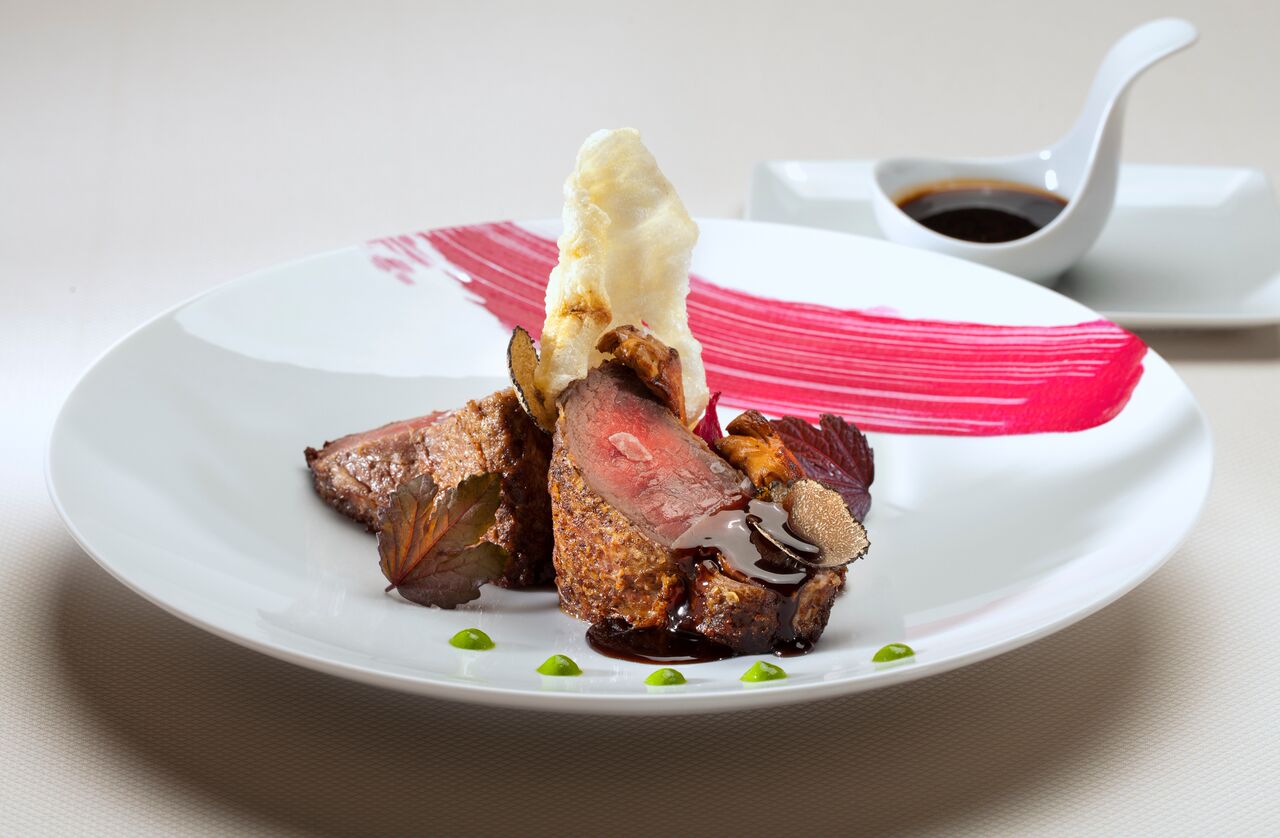 Continuing on our dining journey, we were served our entrees. We had Life of Fowl (Saguaro Lacquered Quail Breast, Game Bird Pâté, Ga’ivsa Porridge, Fabergé Duck Egg Yolk, and a Nest of Yucca Straws) and Bellota Iberico Llomo Wrapped High Country Elk Loin (served with Fossil Creek Chevre Risotto, Wild Mushrooms, Natural Jus and Truffle Emulsion). Additionally, we paired our meals with some fantastic wines suggested by Kai’s sommelier. We’d highly suggest having pairing selected for you because it will truly give you more cohesive experience. There is so much that could be said for the entrees at Kai, but overall they are really fantastic. The elk is prepared exactly how you would want it and was cooked to a perfect medium. The Life of Fowl was a work of art! The egg yolk was perfectly cooked and even dusted with gold leaf!