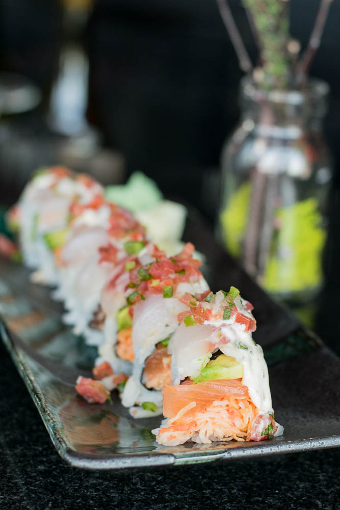 - Cabo Blanco Roll (salmon, spicy crab, avocado, halibut topped with pico de gallo and creamy ponzu)- Fish taco meets sushi is the name of the game with this roll. The creamy ponzu and pico de gallo are so reminiscent of a fish taco’s topping that you might momentarily forget that you are eating sushi. Our server Michael also suggested using a bit of sriracha while eating them and after trying it his way, we never looked back!