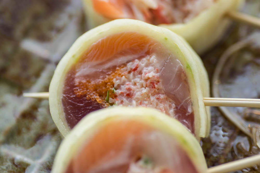 - Original Lollipop Cucumber Wrap Maki (tuna, salmon, whitefish, crab mix, masago and scallions wrapped in cucumber with ponzu sauce)- Replacing traditional rice and nori with cucumber, the Original Lollipop Cucumber Wrap Maki is a fantastic low carb option loaded with flavorful fish! Slightly awkward to eat (think chirashi on a stick), but well worth the effort, this roll is perfect for summer and those looking to leave rice behind. The masago adds a welcome crunch and saltiness to this beautiful maki.